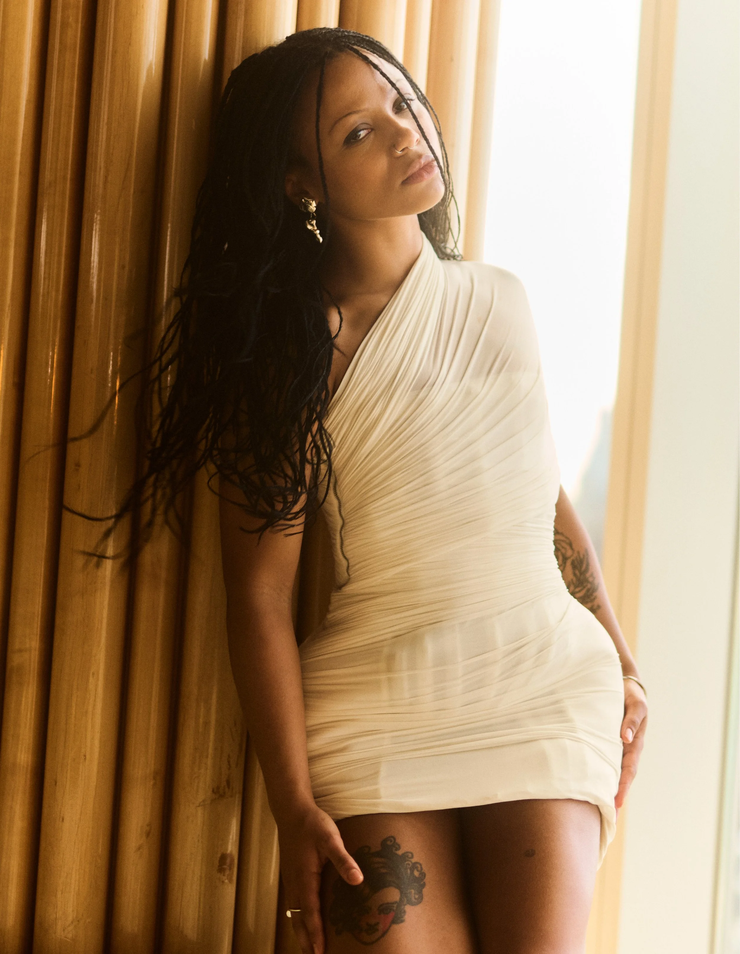 Myha’la wears: top and skirt ELIE SAAB, ring and bracelet PANDORA, shoes AERA. Ken wears: total look DUNHILL.
