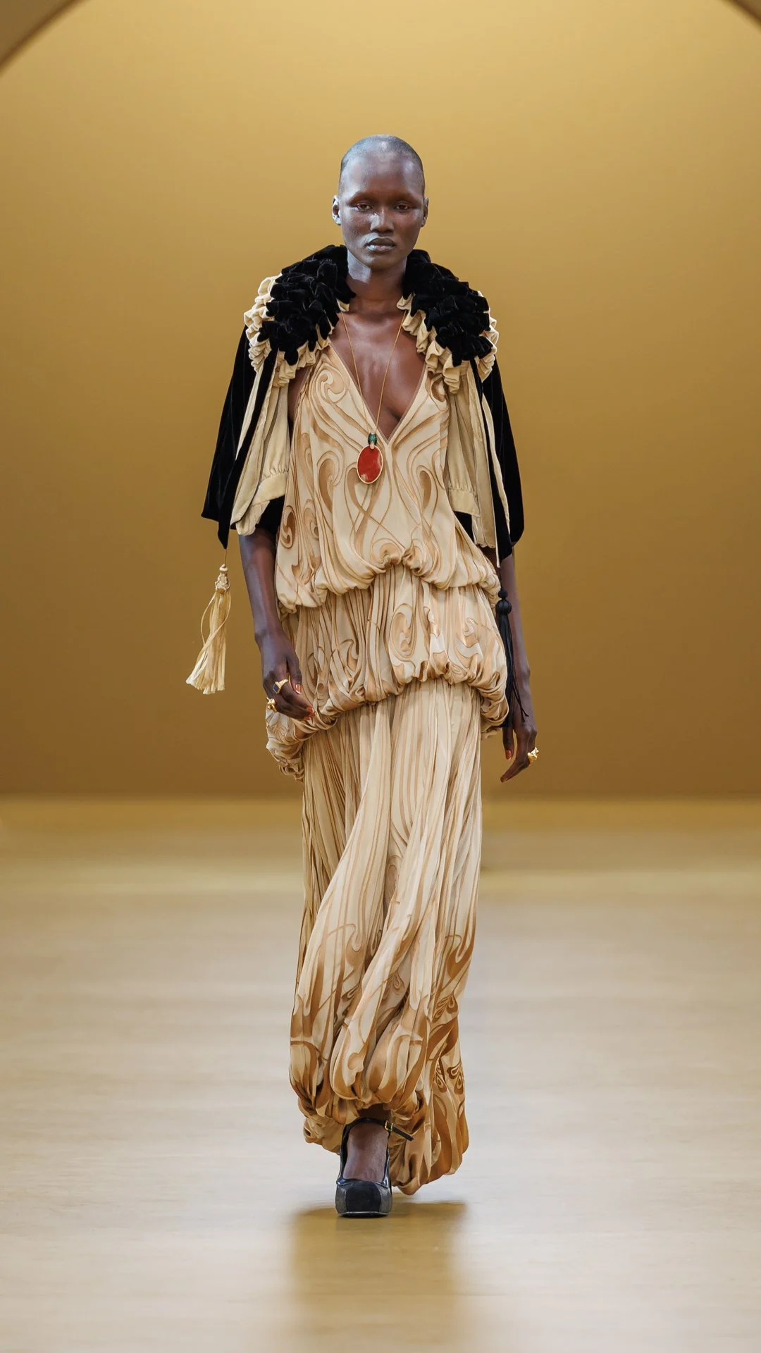 Alongside the season’s precision and tactility, a broader shift in mood also emerged. Whether fashion mirrors the world or resists it remains an open question, yet FW26 leaned unmistakably toward dark romance. In London, Erdem explored historic melancholy through brocades, ribbons, and collaged surfaces that felt emotionally layered, while Simone Rocha’s dark romance felt earthy, feral, and lived-in. At Zimmermann, romance felt lighter but never passive, expressed through fluid silhouettes, sheer layers, and a femininity rooted in control. In Paris, Pierpaolo Piccioli at Balenciaga translated romance into a harder 1990s minimalism defined by second-skin silhouettes and inky palettes, while Haider Ackermann at Tom Ford reframed glamour through latex, sharp tailoring, and deliberately charged eveningwear. The result was a romanticism no longer rooted in softness alone, but in tension, darkness, and emotional weight