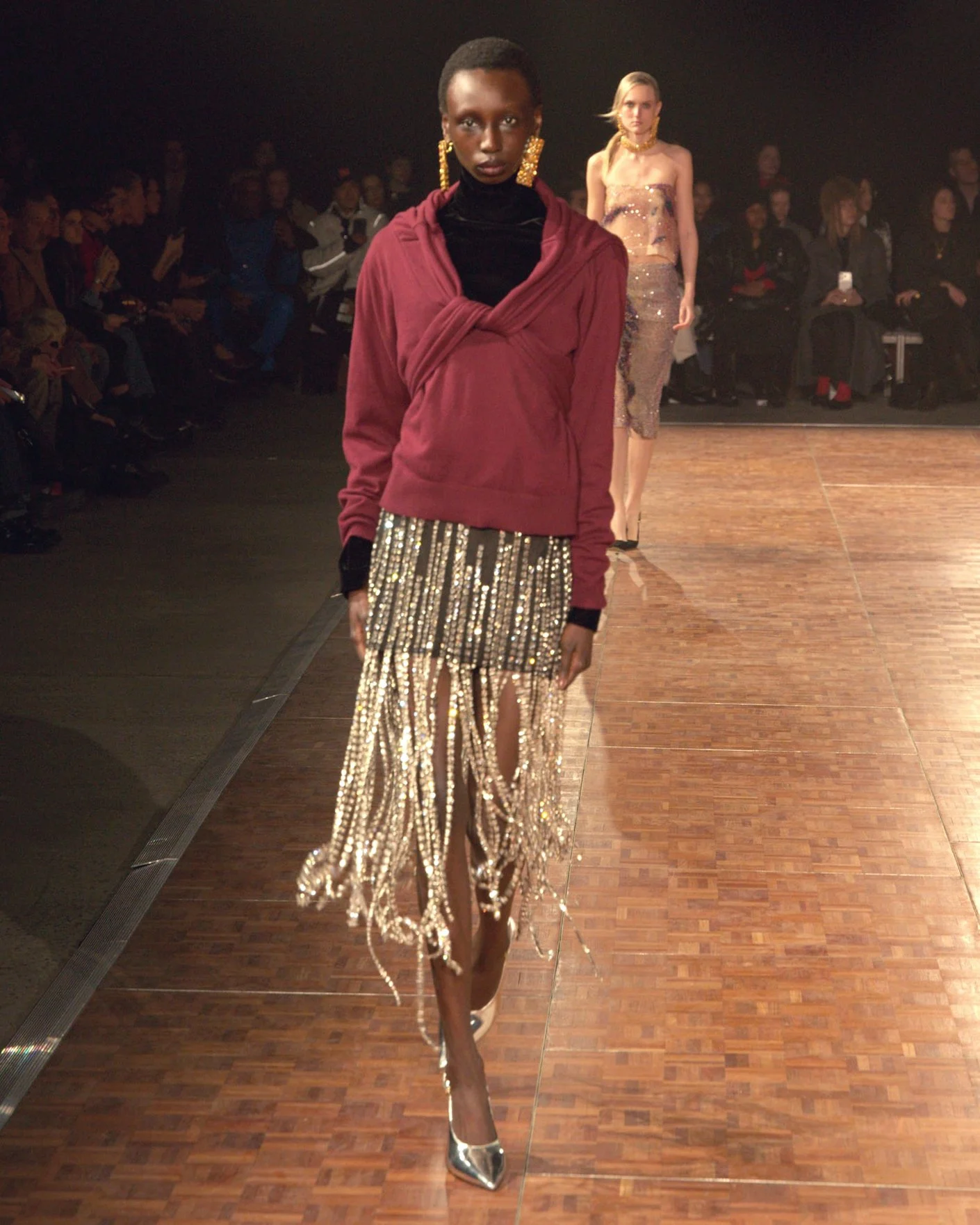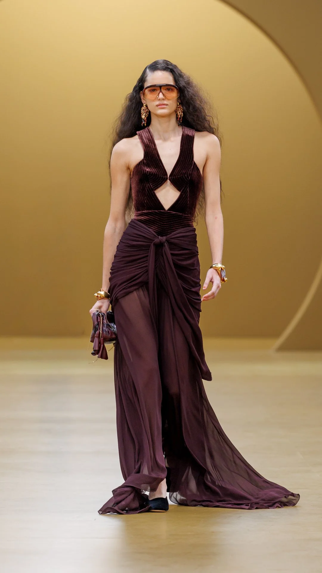 Lace continued its evolution, not as nostalgia but as transformation. At Saint Laurent, lace appeared layered and manipulated, ranging from subtle lining details to fully abstract evening silhouettes. Louise Trotter at Bottega Veneta produced textures that made garments look alive, while Matthieu Blazy at Chanel focused on layered sequins that appeared like shimmering, iridescent scales. Velvet also made a calculated return to the runway, yet in a sleeker, more city-appropriate take. At Alaïa, Pieter Mulier’s slim tailored burgundy velvet was a masterclass in tactile precision—the season's clearest signal that even the most traditional fabrics can be weaponized with a new, sharper romanticism.