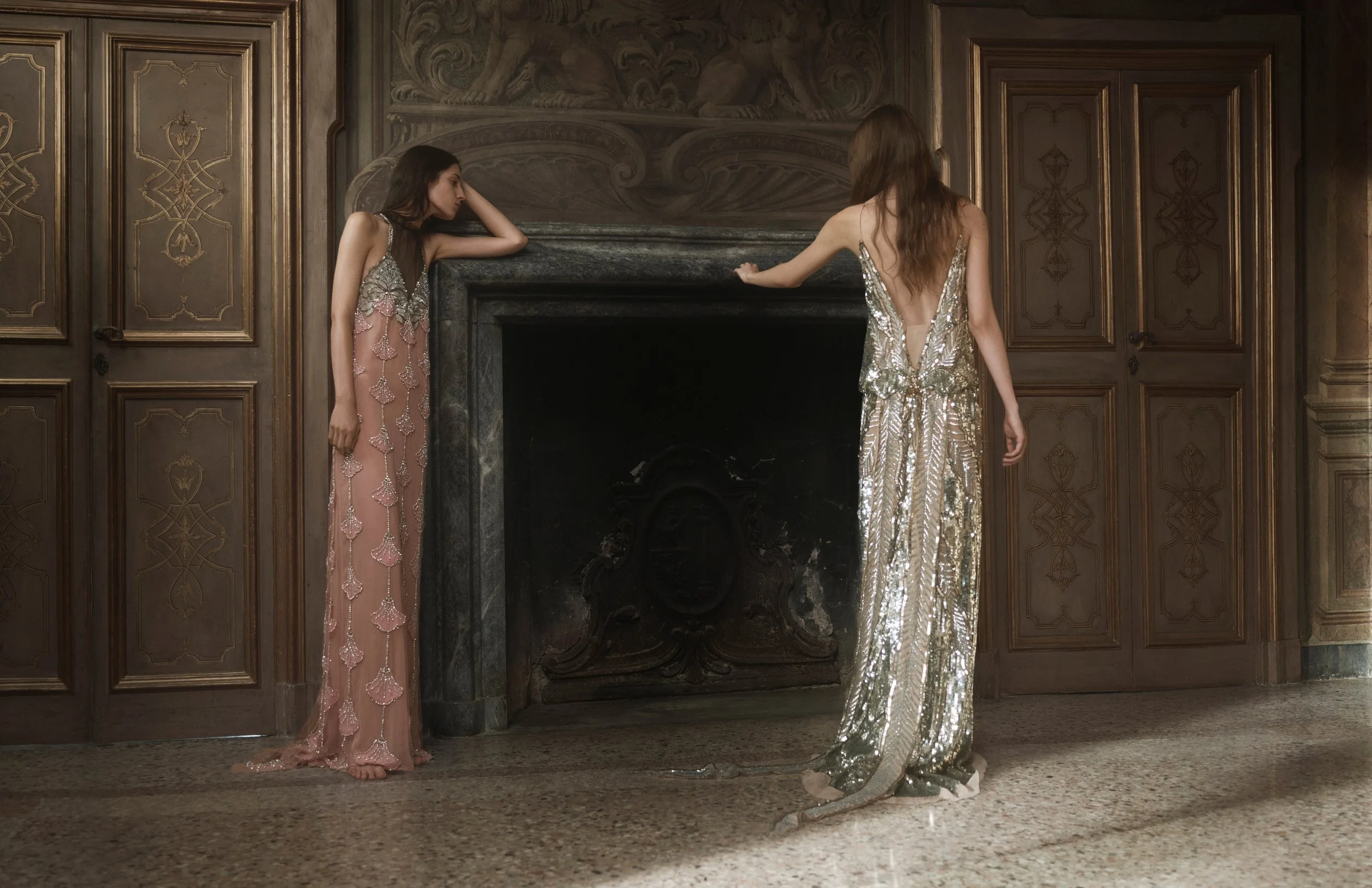 Together the two looks feel like a dialogue between restraint softness and shine, a balance the house returns to again and again.”